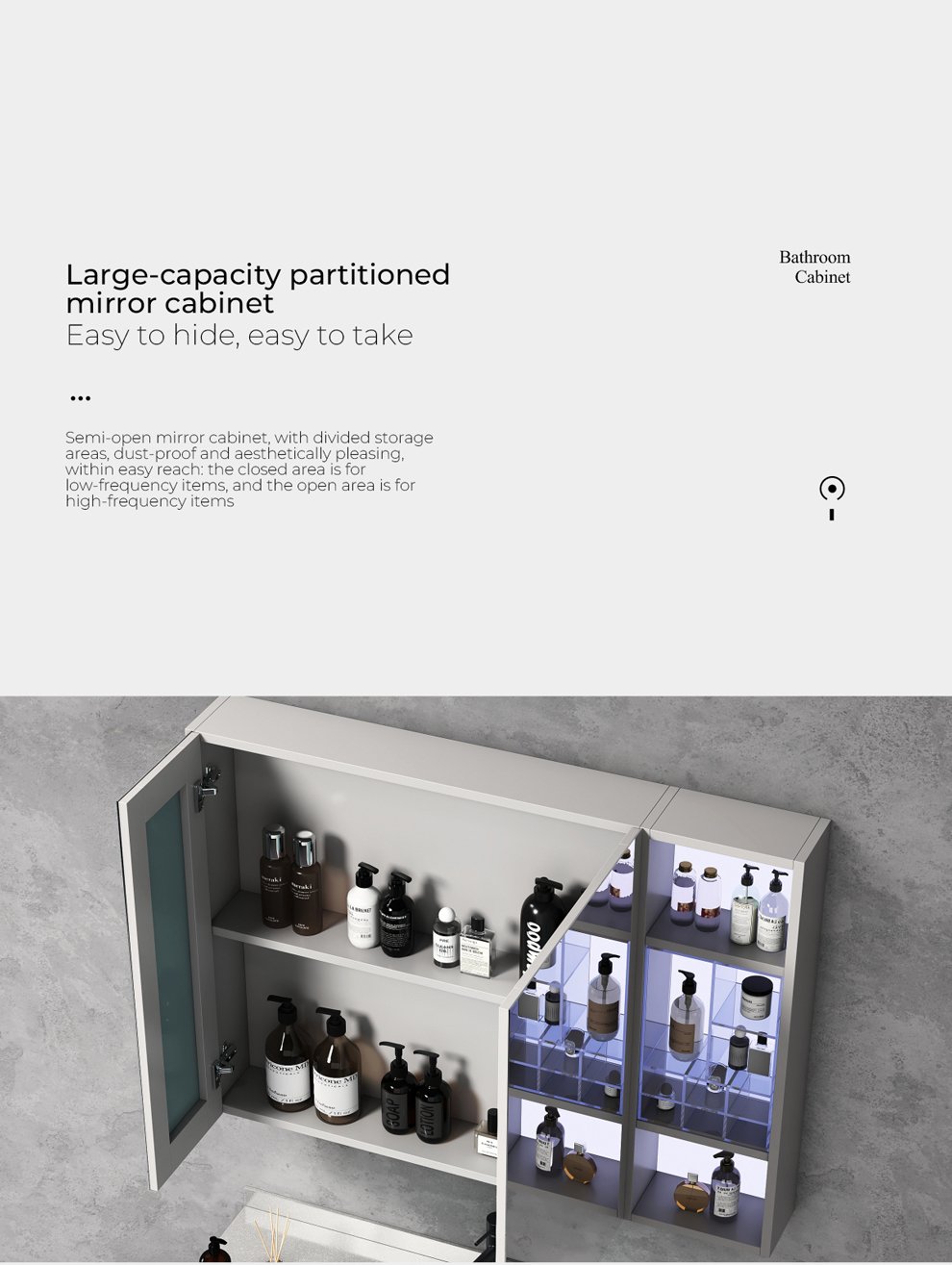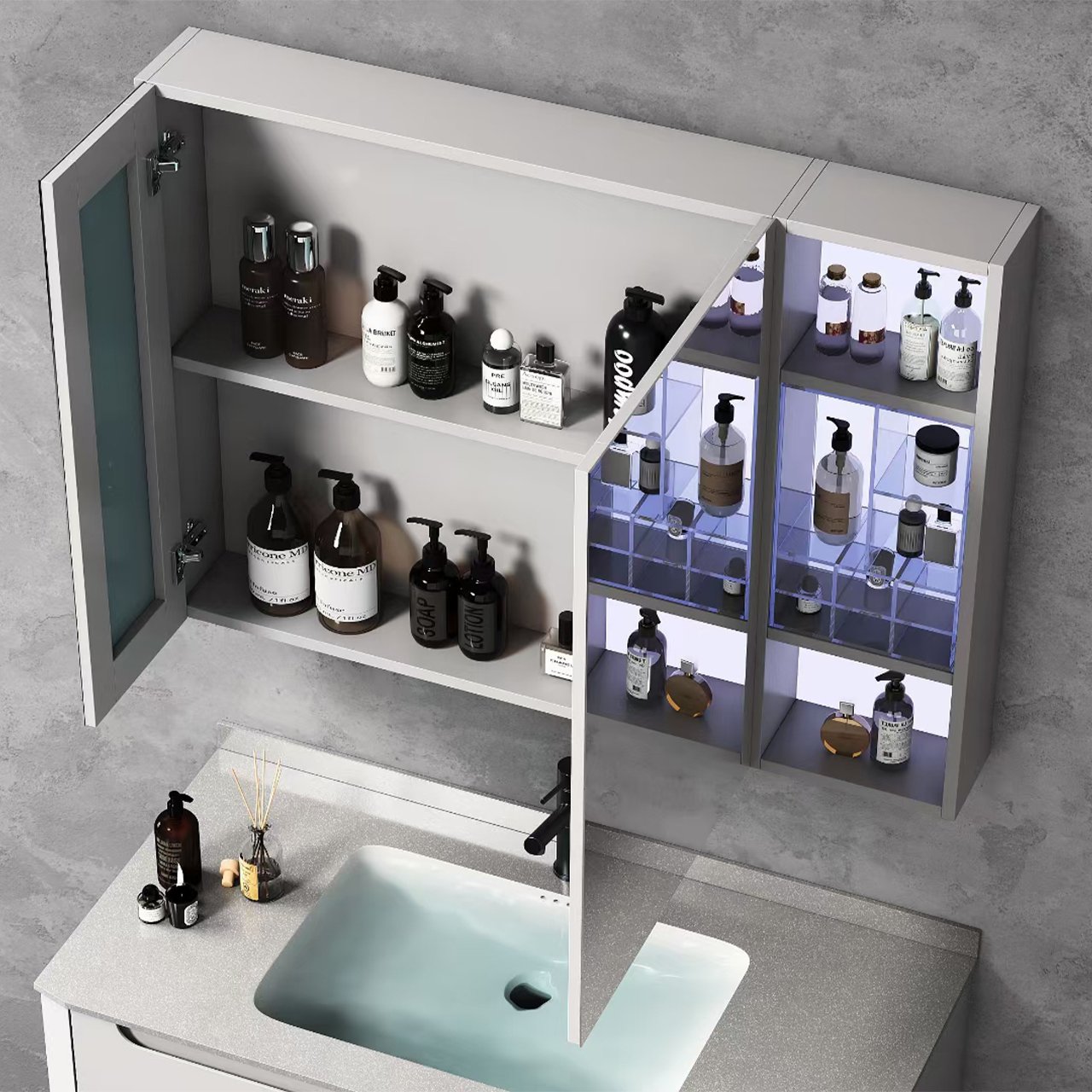 Mirror cabinet: layered glowing board + fully enclosed backboard, inductive glass layer board light + tissue box