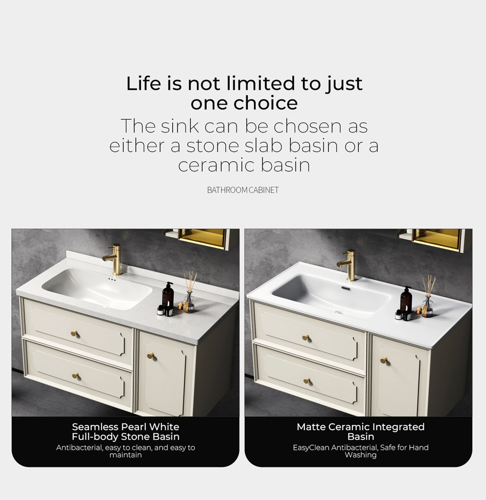 The countertop is entirely made of pearl white granite, and the basin is made of seamless rock slab