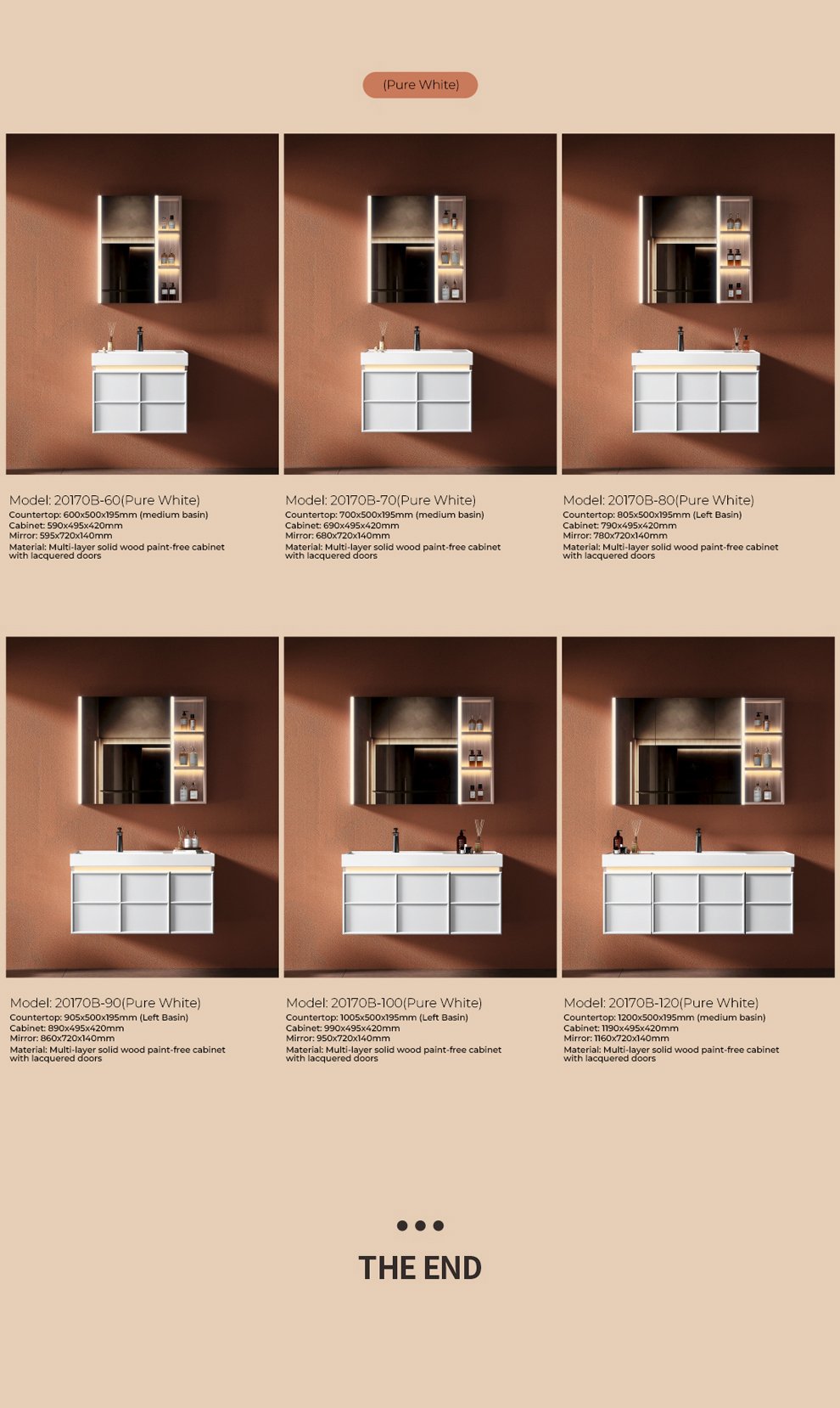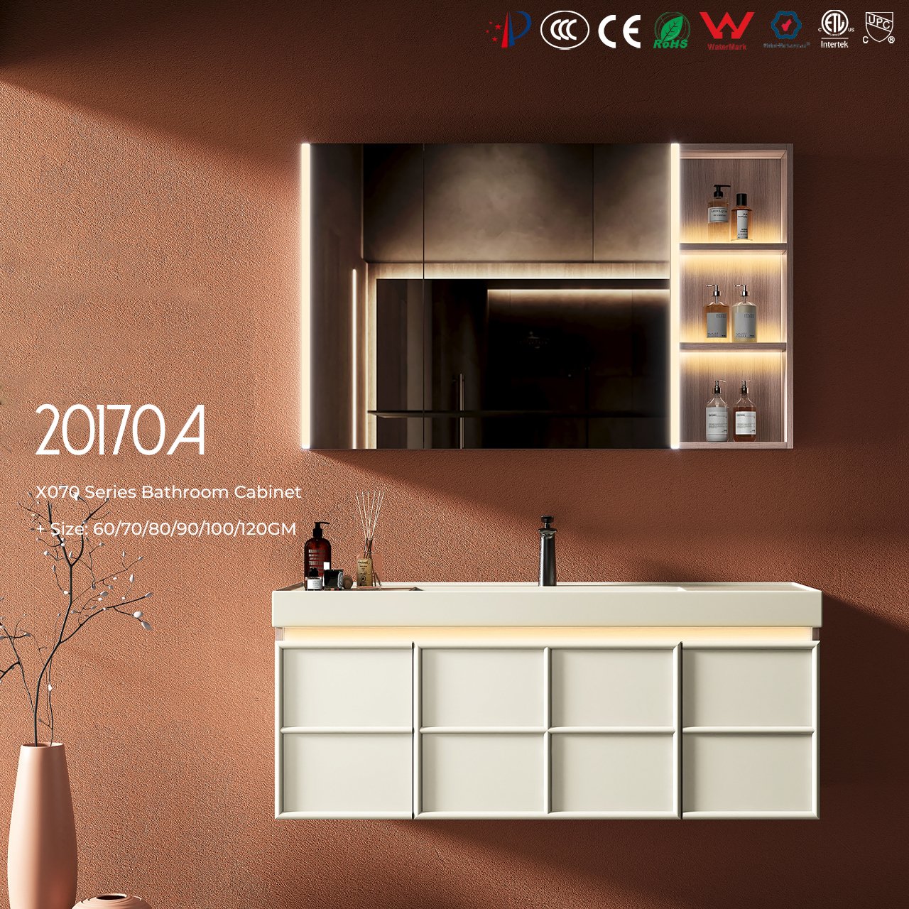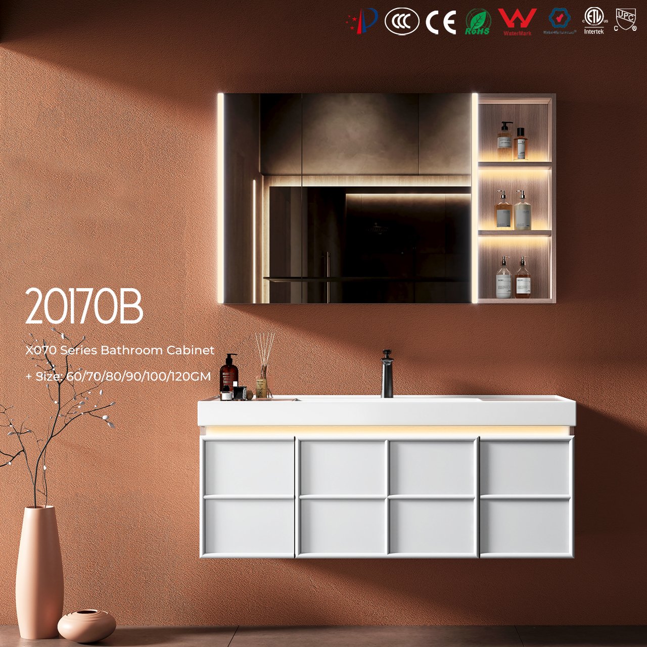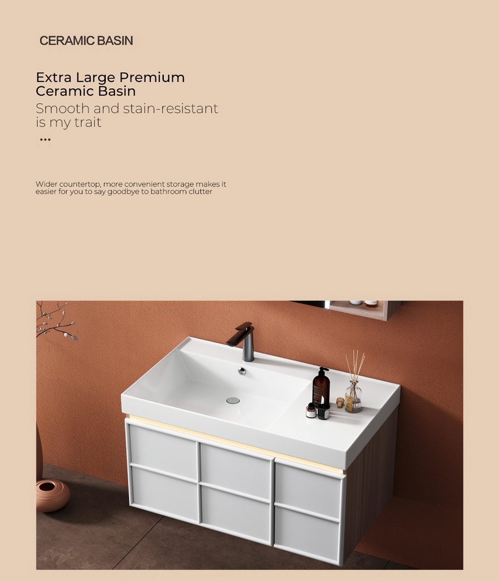 Cabinet body: finished with a walnut wood grain pattern and a creamy white paint finish, featuring an induction light
