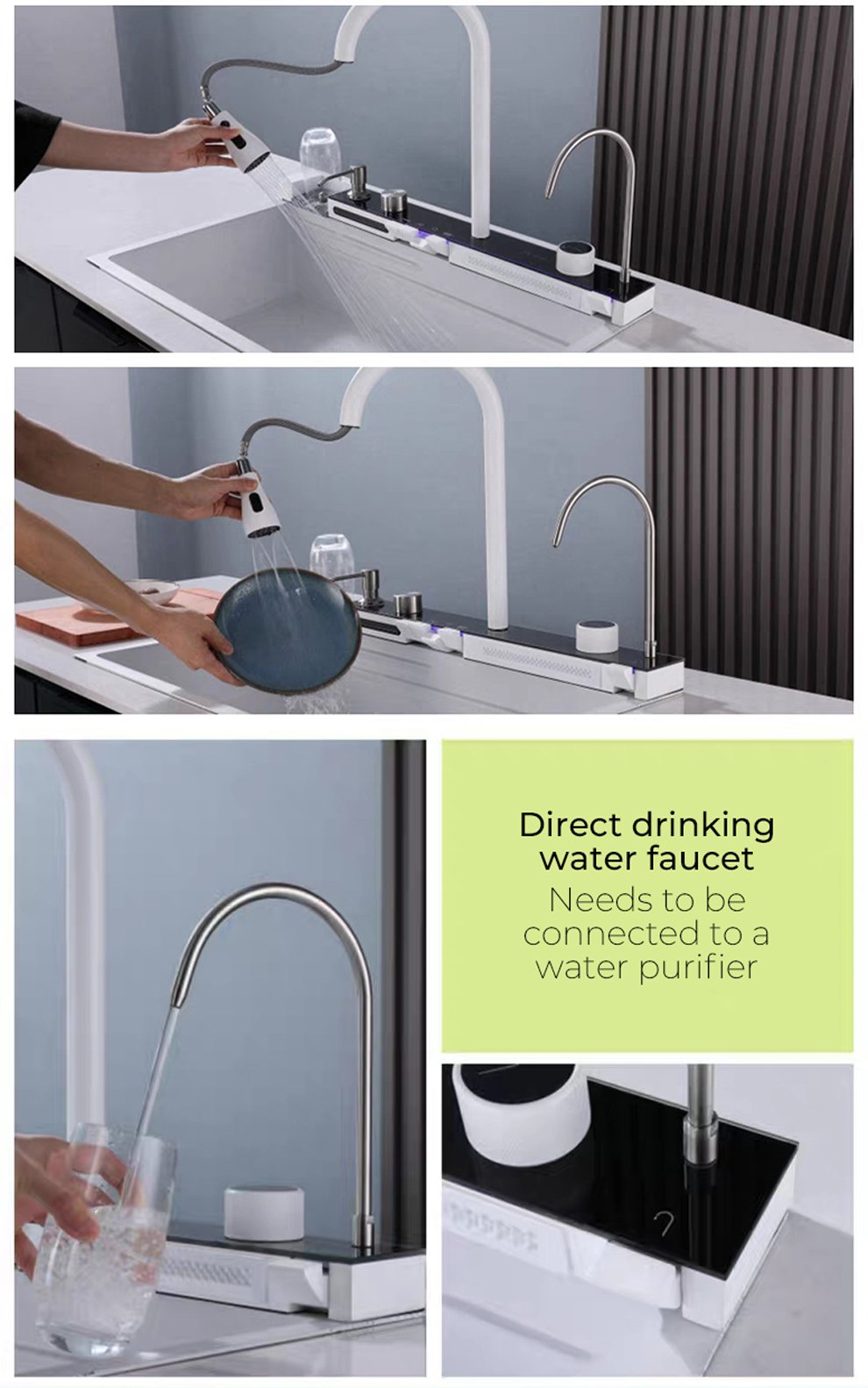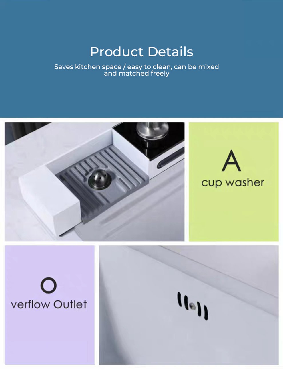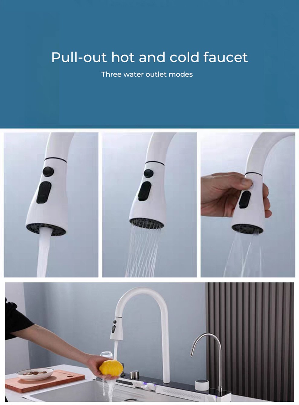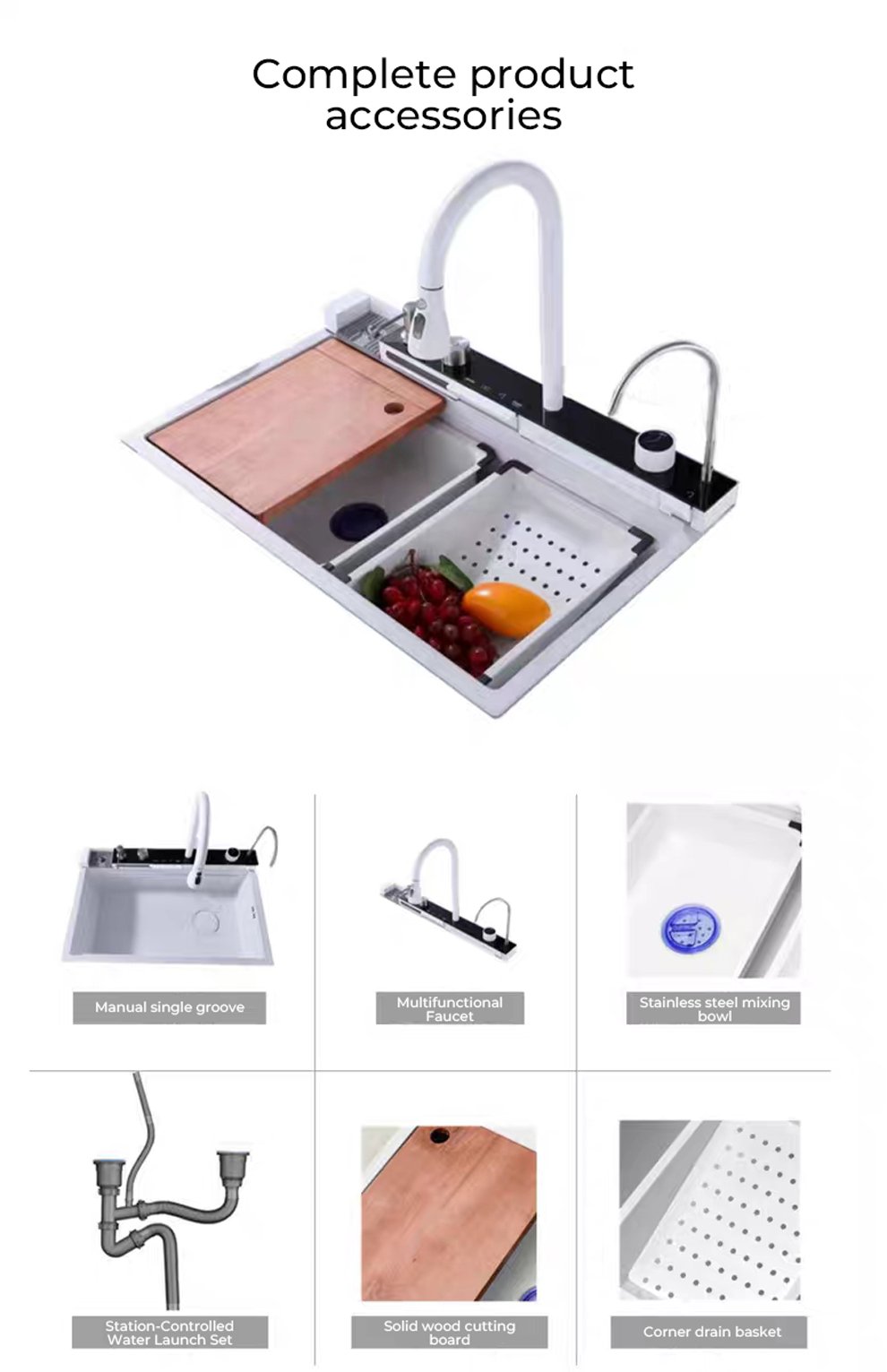 Sink configuration: integrated faucet/honeycomb embossed bare sink/basin within basin/draining basket/cutting board/Taiwan-controlled launch